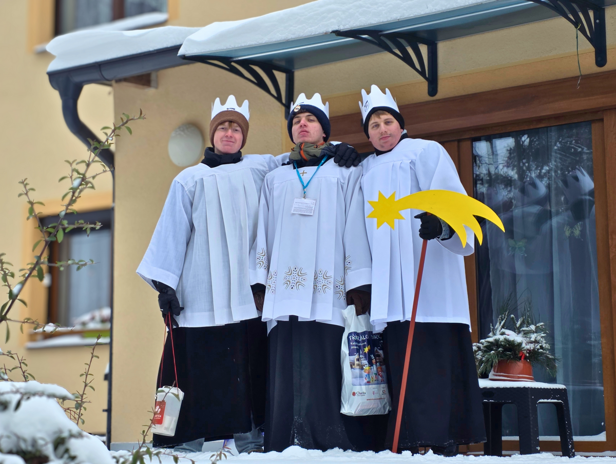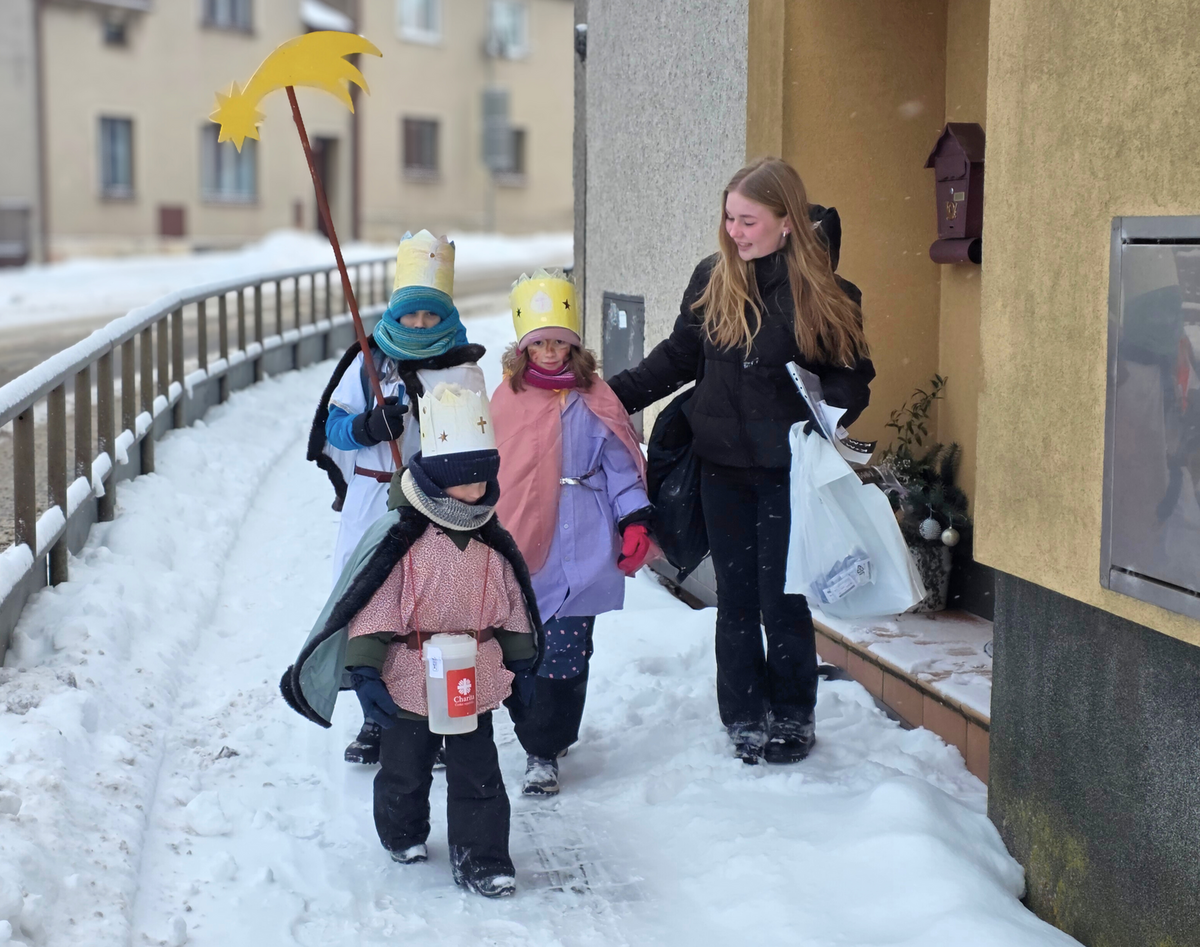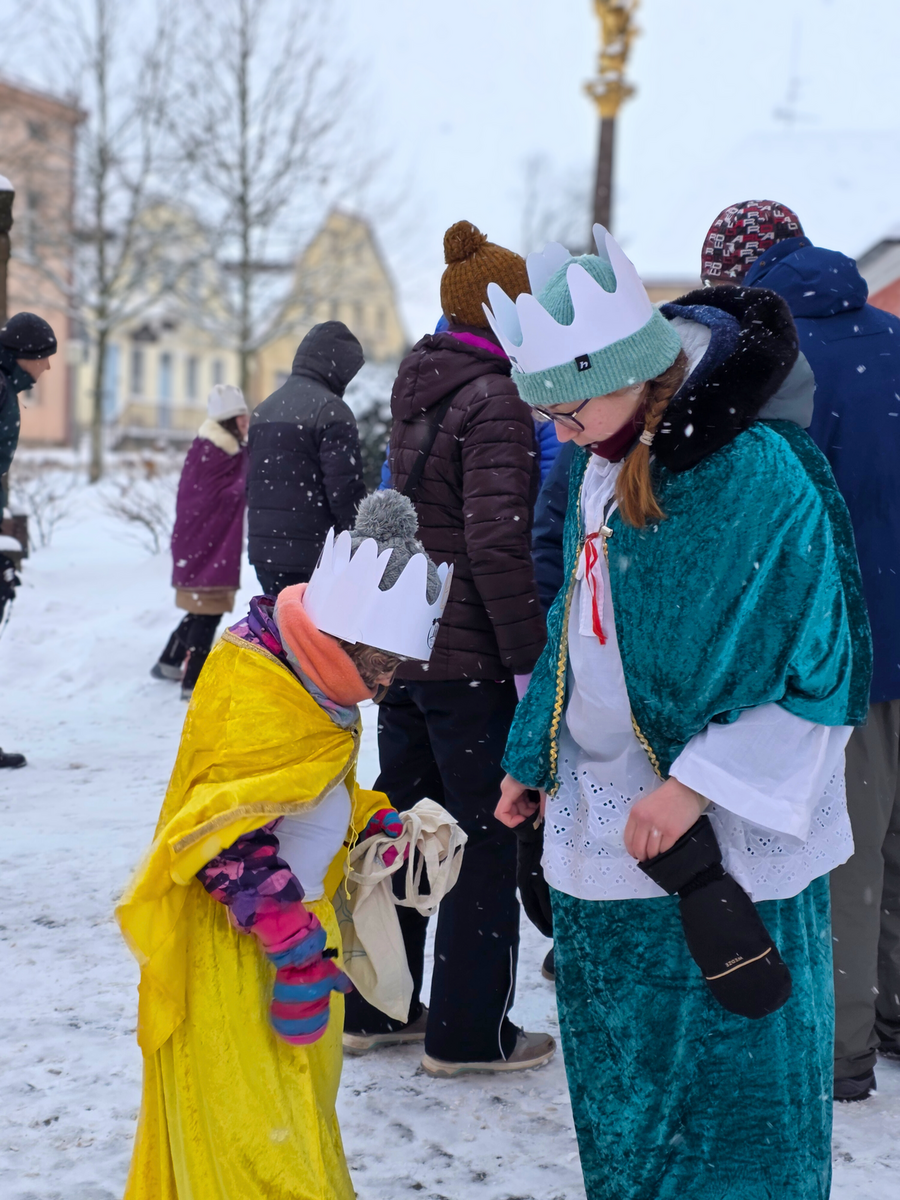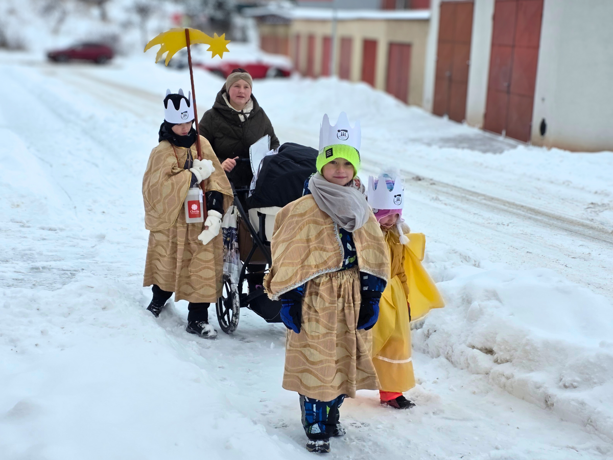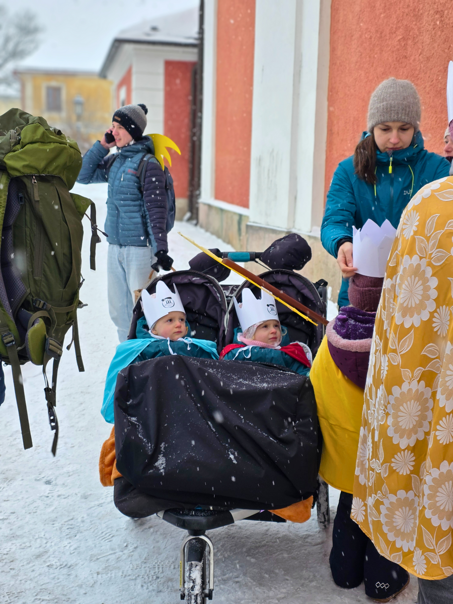 Letos mělo zahájení sbírky u nás výjimečně kouzelnou atmosféru. Po tříkrálové mši svaté nás při odchodu z kostela obklopilo jemné sněžení, které se tiše snášelo do ulic. Zanedlouho už byly vidět další přípravy – malování na obličej, děti s papírovými korunami v kočárcích, skupinky koledníků, které se formovaly před kostelem na společnou fotku.