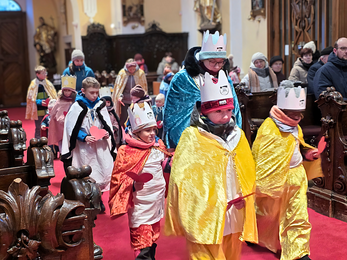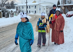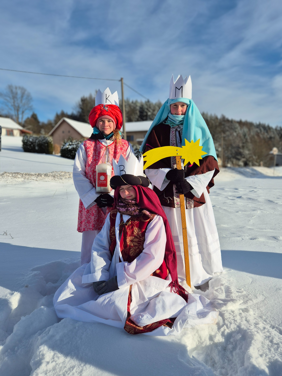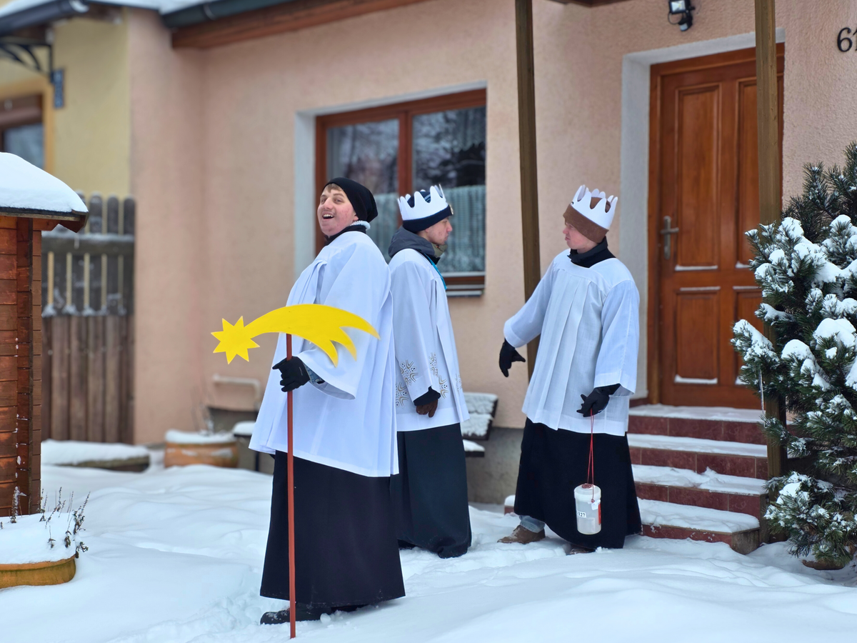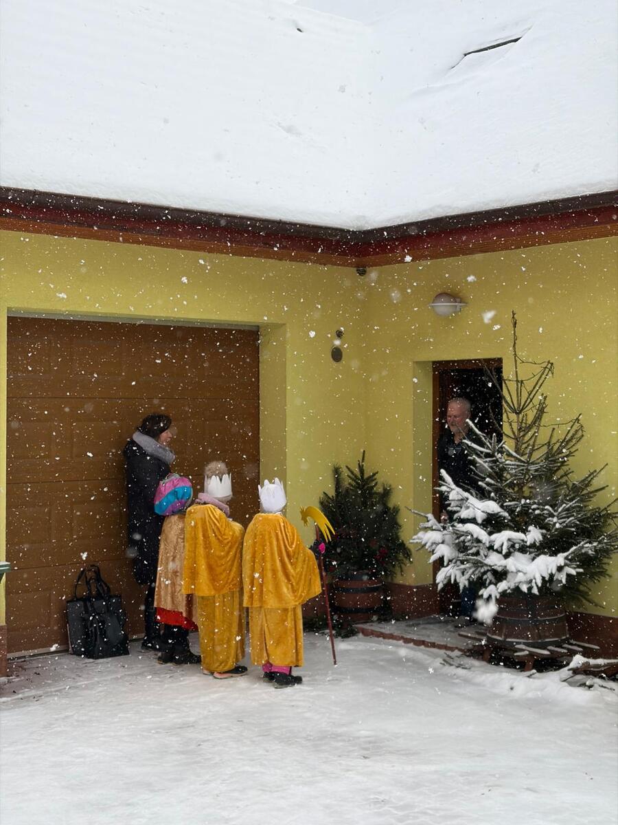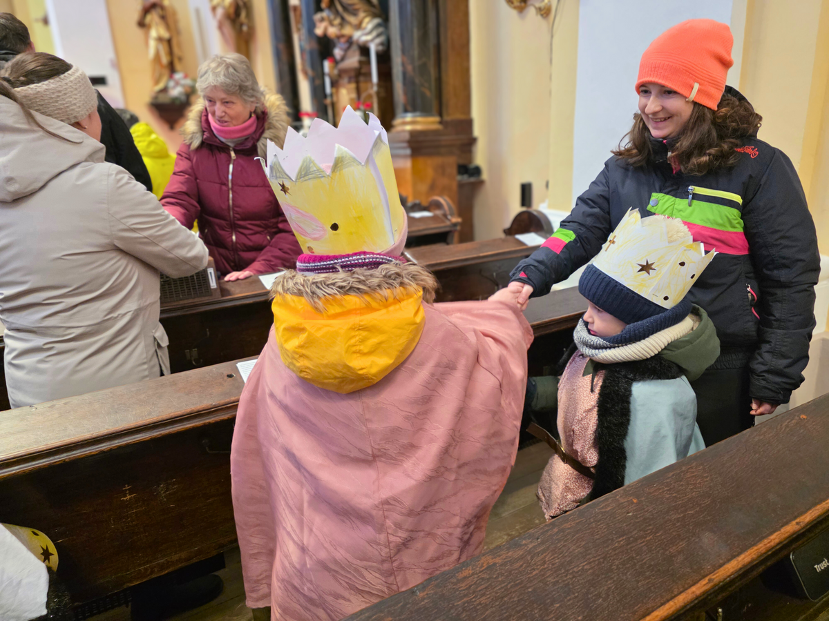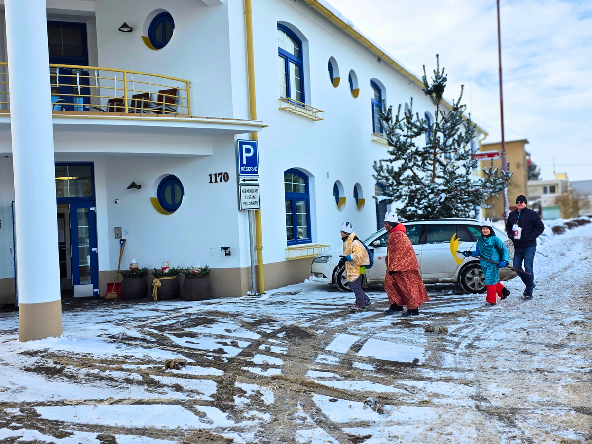 Letos mělo zahájení sbírky u nás výjimečně kouzelnou atmosféru. Po tříkrálové mši svaté nás při odchodu z kostela obklopilo jemné sněžení, které se tiše snášelo do ulic. Zanedlouho už byly vidět další přípravy – malování na obličej, děti s papírovými korunami v kočárcích, skupinky koledníků, které se formovaly před kostelem na společnou fotku.